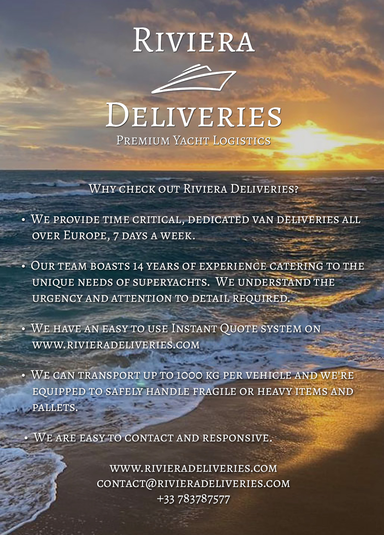 For your peace of mind, Riviera Delvieries (Tender Drops SASU) is a fully licensed transport company and all goods are insured in transit.